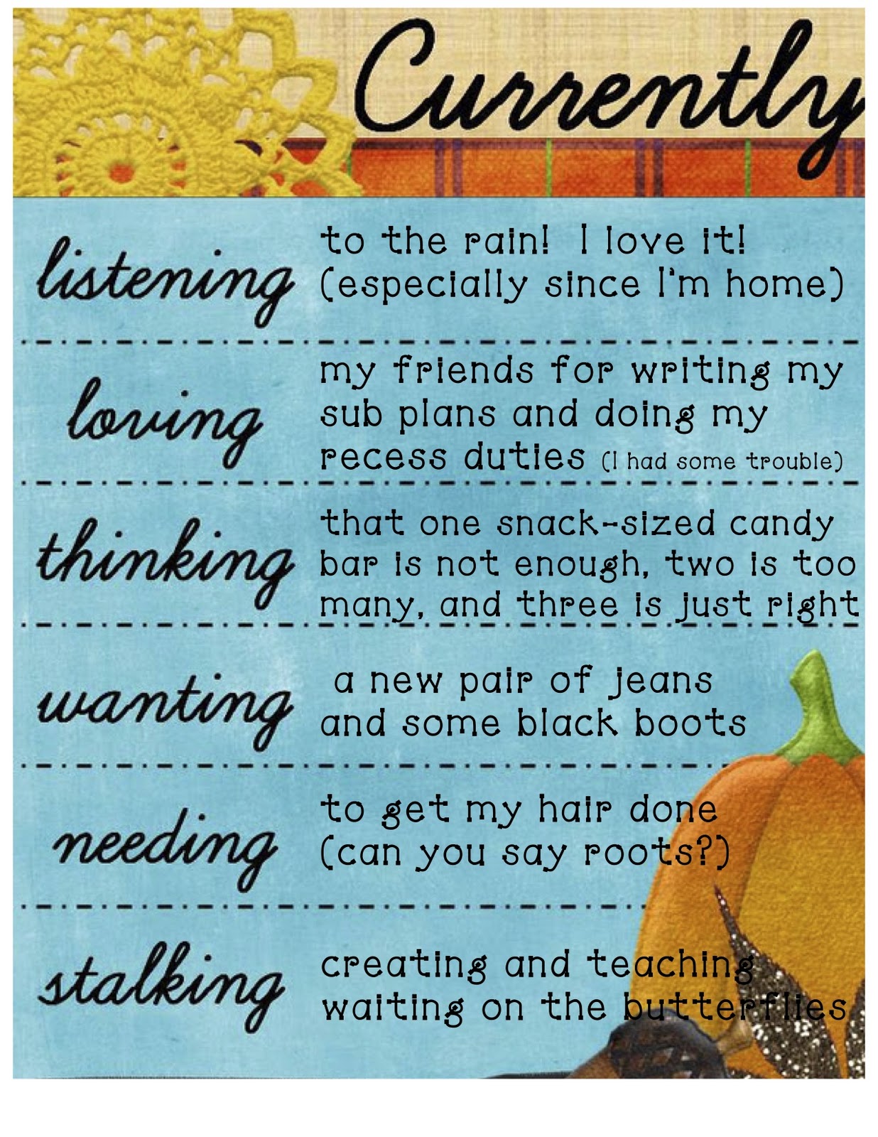 Happy Saturday! Farley over at Oh Boy Fourth Grade is hosting her Currently {what are you doing???) linky party. I look forward to it every month. I should look back at my August through October Currently posts and see if I got what I was “wanting” and “needing”. Anyways, it’s ALREADY November and my twin and I were just talking about how soon she will be here!!!!! Just six weeks! (which means I really need to get my butt in gear and start thinking about Christmas but I tend to procrastinate so I’m not all that worried and my butt can continue to sit here on the couch. That was a really long sentence which also needed some commas but I’m not going back to fix it so please let it go.)
