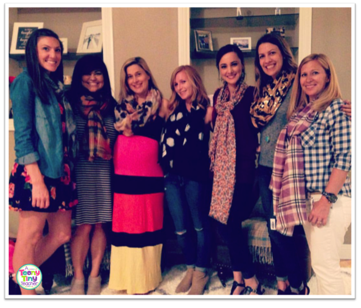 Unfortunately, it was about 100 degrees that day so we only wore our scarves for this picture and then we promptly took them off. The scarf exchange was supposed to be a bit like a white elephant sort-of-deal but, instead, we took turns opening all of the scarves because a) we’re too nice or b) everyone wanted to see all of the scarves in order to see which ones we wanted to steal. So then we had a round two so that we could steal.