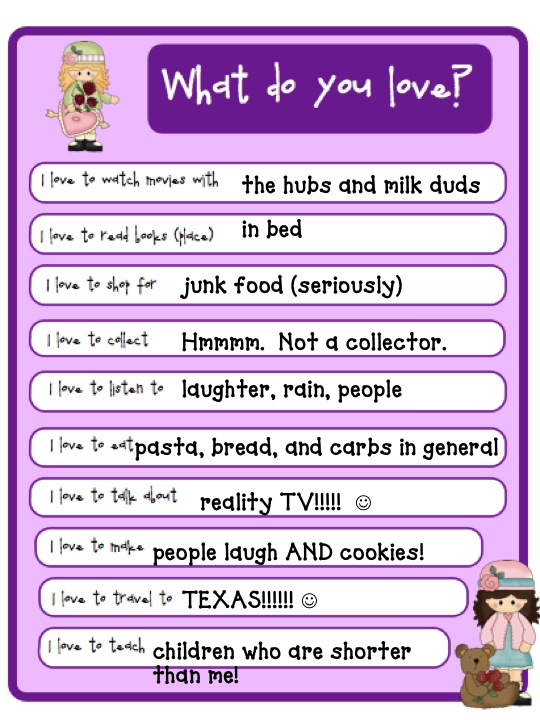 My friend and mentor, Kimberly at Funky First Grade Fun, is having a linky party! Yes! Just what I needed. I am anxiously awaiting Farley’s Currently linky so this will definitely give me my fix. π It’s all about What Do You Love? in honor of Valentine’s Day. I LOVE it. I HEART it. I want to marry it.